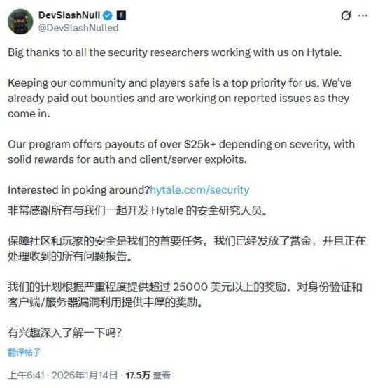 然而,和多数早期访问游戏类似,《Hytale》的首发周也并非毫无波折,游戏存在一些在预期范围内的错误与技术问题。为了保障游戏的安全与稳定运行,开发商Hytale团队于近日正式推出了一项漏洞赏金计划,将为那些发现并报告安全漏洞的玩家提供总额超2.5万美元的奖励。