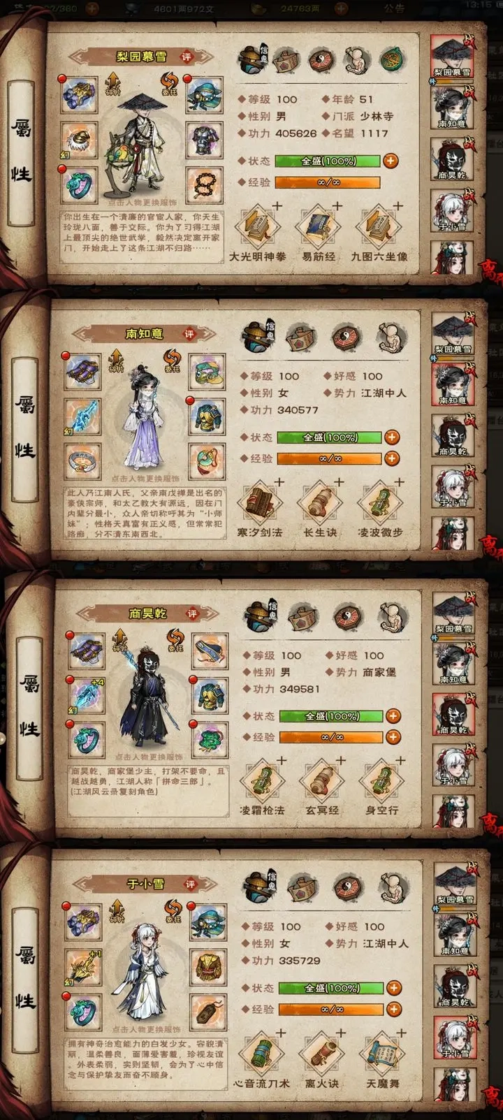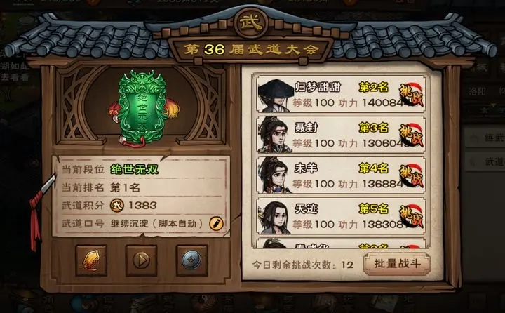 40级后可挑战四位固定NPC获取进阶武功与特殊服饰,他们分别在泰山、姑苏、龙泉镇和双王镇。副本标注的等级只是推荐等级,并非进入限制,实际挑战需以自身战力判断。随从等级能比主角高两级。在游戏内活动页面输入特定邀请码,可领取含元宝、阅历和体力的新手资源奖励,该奖励仅和自身账号情况有关。部分门派秘技需在夜间用轻功潜入藏经阁才能获得。