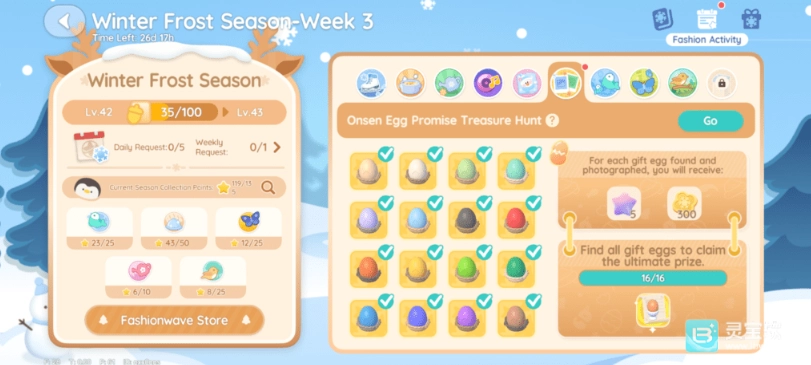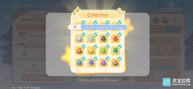 在收集到第16个蛋的照片后,你会马上接到Naughty的电话。他表示会把配方给你,但配方不会自动解锁。要在心之乐园获取温泉蛋配方,你得从屏幕顶部的雪人图标打开时尚浪潮活动应用,然后按照图示,在蛋类收集页面进行领取。