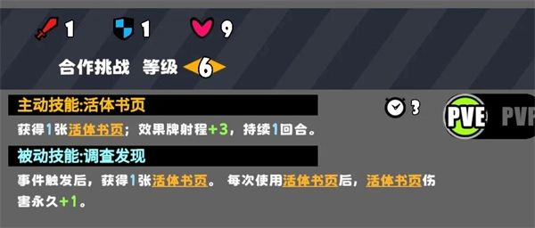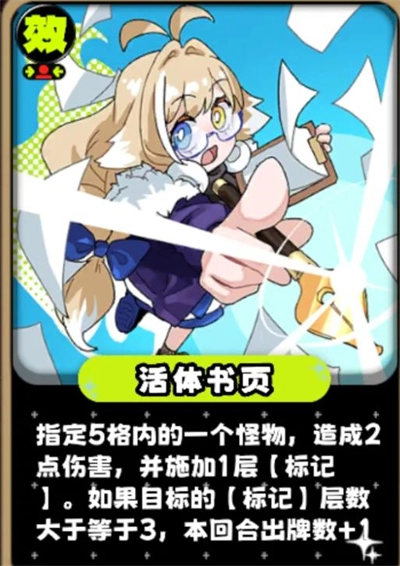 2、活体书页的初始射程为5,开启技能后射程会增加3,达到8格。基础伤害只有2点,但搭配凛的被动效果,每次使用活体书页后,它的伤害就会永久+1,到了游戏后期叠到十几点伤害是很常见的情况。造成伤害后会给目标施加一层标记,最关键的是,如果目标身上的「标记」层数≥3,本回合的出牌数就会+1。这有点像“风水的符卡·福”,虽然有使用限制,但只要满足条件,就能一口气把手里所有的活体书页都打出去,直到出牌数达到9张上限。不过和固定两点伤害的“风水的符卡·福”不同,活体书页的伤害会随着使用次数不断增强,能轻松打出上百点无视防御的输出;要是再配合金飞镖的效果,叠出数百点伤害也并非不可能。