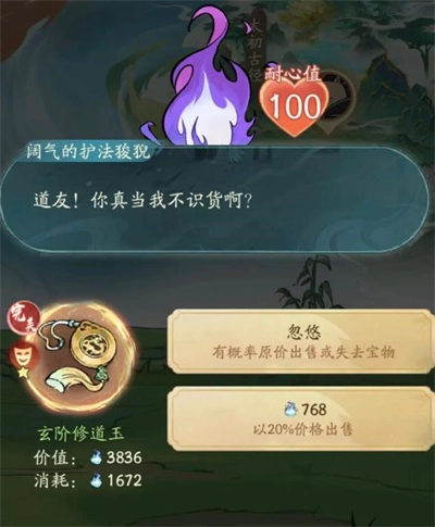 3、关于镇压/破禁/强卖法宝类事件的处理: - 镇压妖兽、破禁:全部选择111(最低成功率选项),故意让操作失败,这样能避免获得低阶法宝占用背包,从而影响后续卖货;要是背包处于空的状态,可以酌情拿1个。 - 强卖法宝、阵法类:所有选项都点最左边的,不要领取法宝,防止占用背包空间。