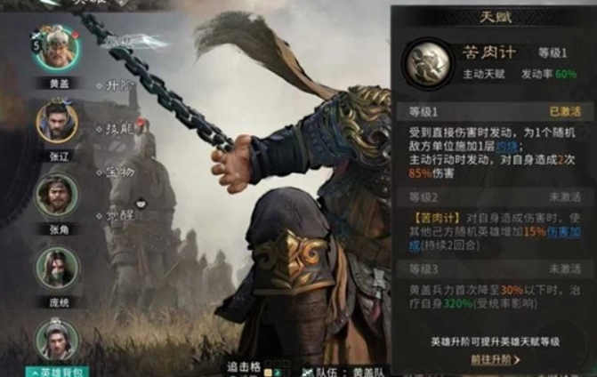 围绕黄盖的天赋“苦肉计”来展开。每当他受到直接伤害,就会自动给一名随机敌人加上一层灼烧效果。黄盖主动行动时也能触发这个效果,不过得承受两次基于自身兵力的损失。虽然每次损失不算大,但积累多了会对他的生存造成影响,玩家得留意控制触发的频率。