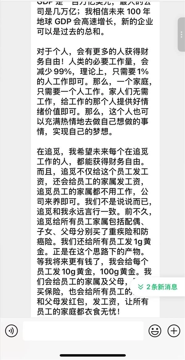 俞浩着重指出这绝非酒后的随意之言,而是经过“极为理性的分析推断”,具体的逻辑脉络他会在后续通过著书来详细阐释。与此同时,他也向员工们做出了承诺:“追觅的每一位成员都理应实现财务自由!我的朋友们也都理应实现财务自由!”