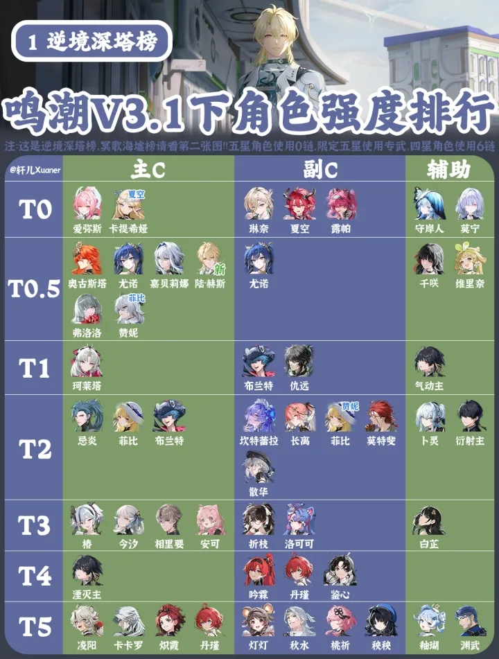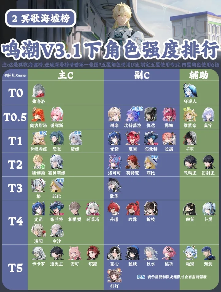随着3.X时代两位新主C的登场,角色池的深度得到了显著提升。本次更新中,我们新增了T5评级,并对所有角色的档位进行了重新划分。调整之后,各个梯队之间的区分度变得更为清晰,不过本期暂时不会标注角色的升降趋势,我们会在版本稳定之后恢复动态标识。