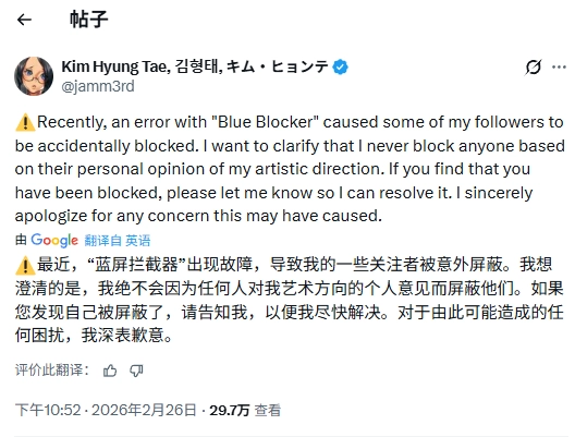 不久后,金亨泰发布声明,说明拉黑行为是浏览器扩展程序“Blue Blocker”引发的“误操作”:“近期,因‘Blue Blocker’出现故障,我的部分关注者被意外拉黑了。我在此澄清,我从未因为任何人对我艺术方向的个人意见而拉黑他们。如果您发现自己被拉黑,请联系我处理。对于可能造成的任何困扰,我深感抱歉。”