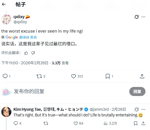 有网友回复说这是“我这辈子见过最烂的借口”,金亨泰回应道:“确实是这样。但这就是事实——我还能有什么办法呢?人生本就残酷又荒唐。”