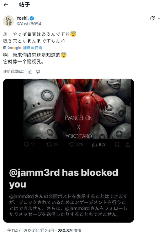 日前,《尼尔》系列制作人横尾太郎宣布将执导经典IP《EVA》的新作项目。作为横尾的长期粉丝,金亨泰在社交平台X上发布贺图祝贺,图中《EVA》主要角色明日香穿着标志性红色战斗服,坐在一堆微笑的埃米尔头骨上。