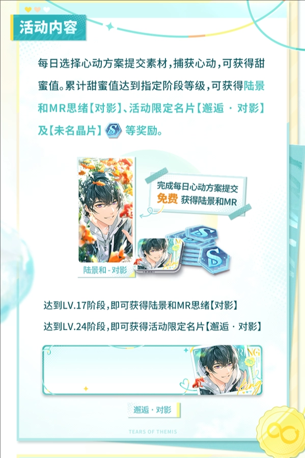 当累计甜蜜值达到指定阶段等级时,律师能够获取陆景和MR思绪【对影】、活动限定名片【邂逅·对影】以及【未名晶片】等丰富奖励。