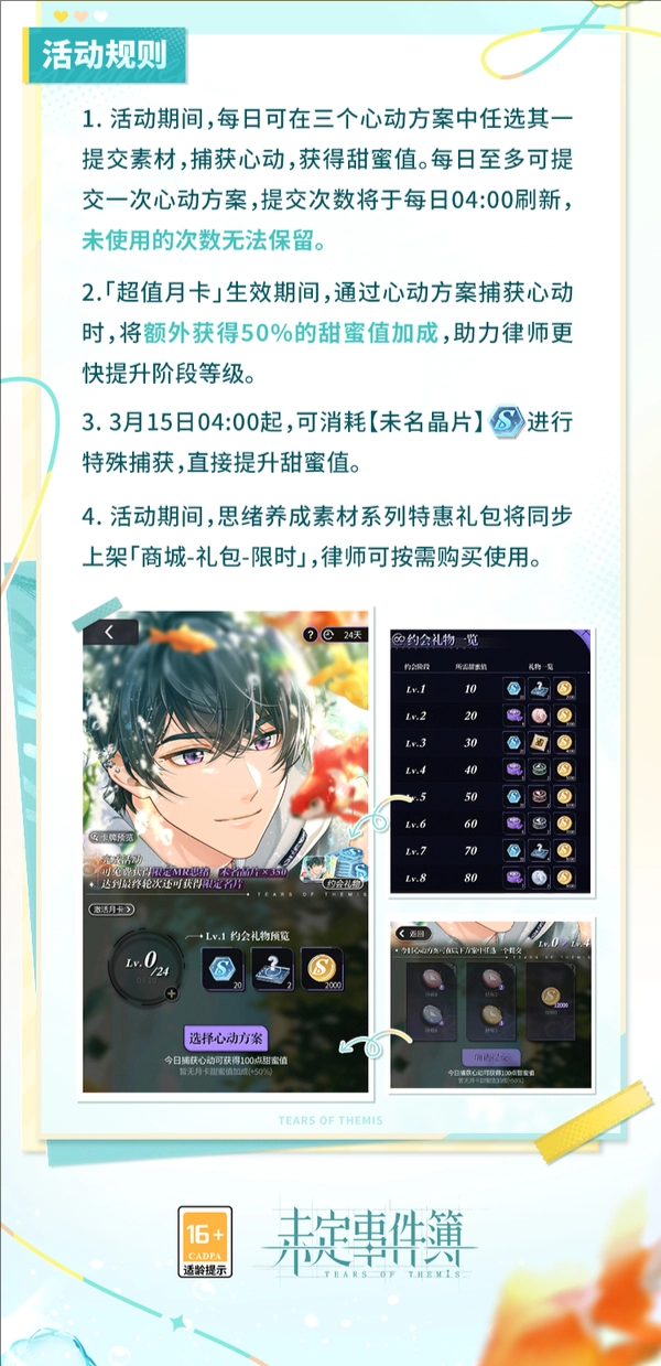 活动进行期间,律师每天都能挑选不同的「心动方案」,提交对应的素材来捕获心动,以此获取甜蜜值。
