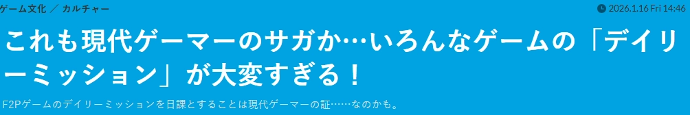 free-to-play(F2P)是当前网络游戏行业的主流商业模式,简单来说就是基本免费的游戏。最近有位日本玩家抱怨自己每天都习惯性地完成好几款游戏的日常任务,这一话题引发了热烈讨论,其他玩家纷纷表示“强迫症真的伤不起”。
