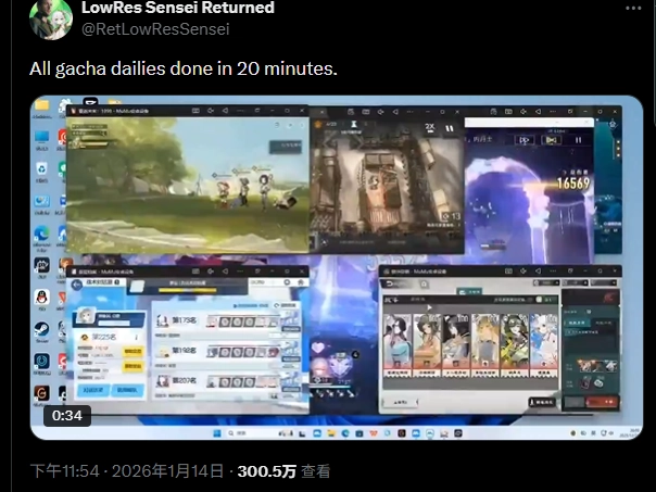 LowRes Sensei Returned玩家发推,吐槽自己的“强迫症”,目前正在玩的好几个免费游戏,疯狂地同时切换多个页游做日常任务,即便操作熟练也花了20分钟。