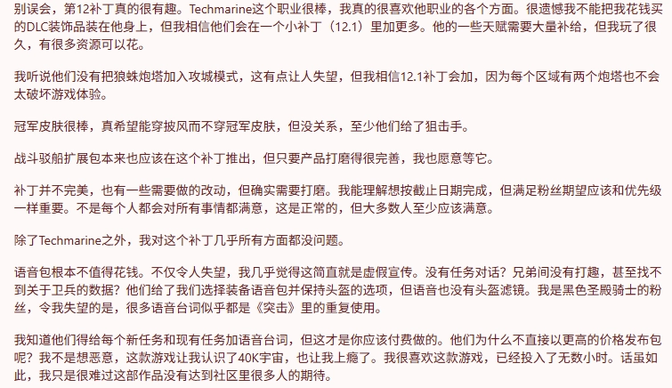 《战锤40K:星际战士2》12.0版本补丁已于本周正式上线,此次更新新增了可玩职业“技术军士”。与此同时推出的首个语音包DLC,由于实际内容与宣传存在差异,引发了玩家的不满情绪。截至目前,该DLC在Steam平台上的评价为“特别差评”。