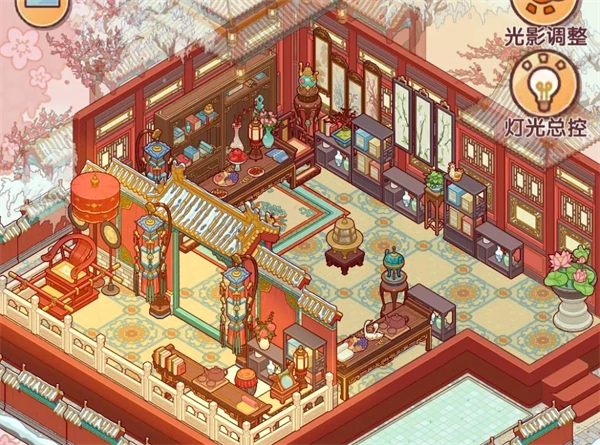 4、第四关:阳台区域的大书桌上,按顺序放置着两摞书和茶具;旁边的黄色小桌上摆放着梳妆镜与小灯;靠近门口的小书柜上有蔷薇花摆件(藏在靠近凤辇的宫灯后方);里面的两张书桌上放置了部分摆件;靠墙的大小书柜按图示位置摆放;梅花摆件放在书籍旁边;公鸡摆件则放在靠外的书柜顶部。