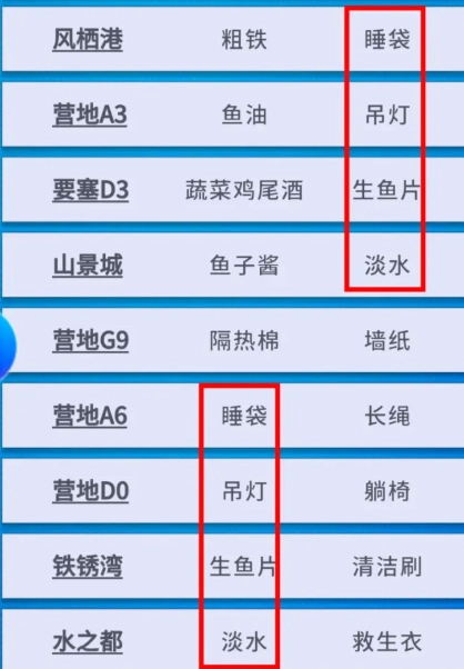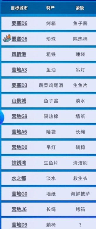 3、这就意味着,只要你摸清了某个港口的“紧缺”物资,大致就能确定:“根据上述商情图可知,只要沿着地图上间隔4个港口的方向去寻找,肯定能找到对应的紧缺港口!”。特产活动进行期间,情况都是相同的,而且特产和紧缺的整体顺序保持一致,比如【 特产 】里吊灯的上方是睡袋,下方是生鱼片,那么在【 紧缺 】里,吊灯的上方也必然是睡袋,下方也必然是生鱼片。