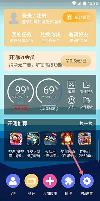 1、第一步:开启root权限需开通vip会员,操作时先打开软件,再点击【vm设置】。