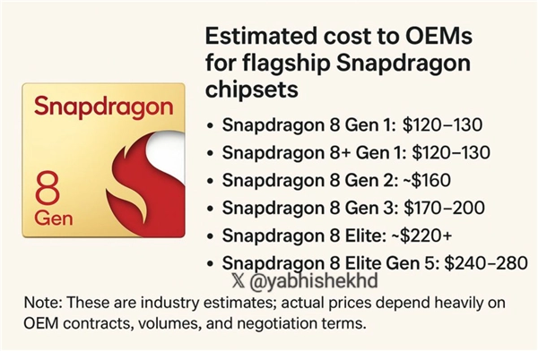 在安卓阵营里,高通今年将推出采用2nm工艺的骁龙8E6芯片,其具体成本目前还不清楚。不过去年3nm制程的骁龙8E5,有传闻称成本大概在240至280美元的区间内。按照这个趋势,今年的成本哪怕只是略微上涨一些,恐怕都要达到300美元了,这比苹果的A20芯片价格还要高。毕竟骁龙芯片还需要集成高性能的基带芯片,成本自然会更高一些。