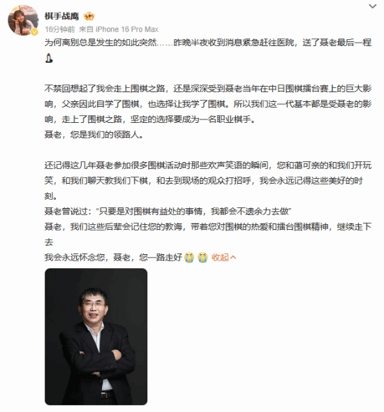 值得一提的是,聂老离世的消息公开当天,战鹰便在微博发文悼念:“聂老,我们后辈会铭记您的教诲,秉持您对围棋的热爱与擂台围棋精神继续前行。我会永远怀念您,聂老,愿您一路走好。”