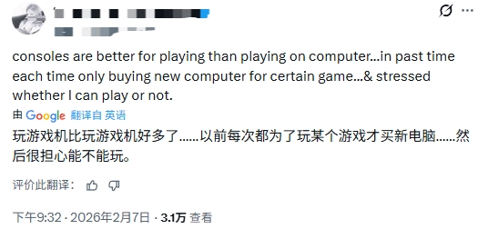 推文发出后,马上就吸引了众多玩家的关注和讨论。有玩家称:“主机比电脑更适合玩游戏,以前每次想玩某款游戏都得买新电脑,还总是担心能不能流畅运行,心里压力挺大的。”