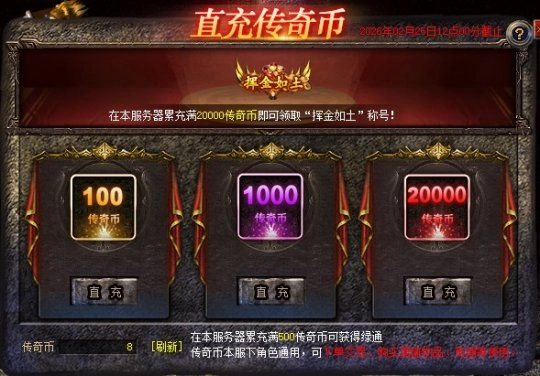 注意事项:(1) 累计充值数据的统计可能存在轻微延迟,我们会在1个工作日内为满足条件的玩家开通绿通服务。(2) 游戏内通过元宝兑换的传奇币不纳入统计范围。(三)在“挥金如土”称号活动期间,若游戏账号在“百区合击”服务器的累计“预充值”金额达到20000传奇币,将获得且仅能获得1次“挥金如土”称号。该称号会自动发放至该充值账号下首个进入服务器的角色。