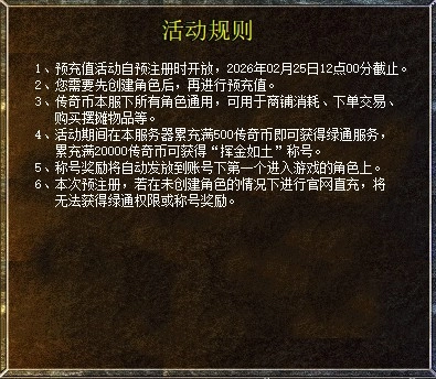 注意事项:1.只有完成预创建角色的账号,才可以获得绿通资格与挥金如土称号!2.游戏内元宝兑换传奇币不计算在“预充值”内。