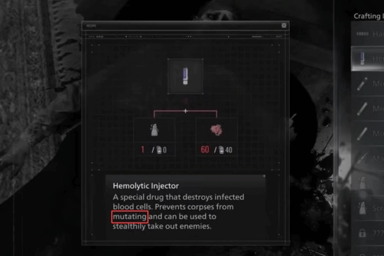 在Reddit论坛上,有玩家留意到,卡普空在昨天的发布会上对全新升级的制作系统进行了详细讲解,还展示了一款名为“溶血注射器(Hemolytic Injector)”的道具。单看表面似乎没什么特别之处,但该道具的说明里提到“能够破坏受感染的血细胞”以及“避免尸体出现变异”,这两点内容听起来,确实和针对红头丧尸的功能十分相似。