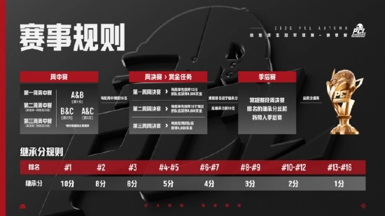 常规赛阶段各周决赛排名对应的继承分总和将被带入季后赛,最终总积分排名第一的队伍将成为2025PCL秋季赛的冠军。