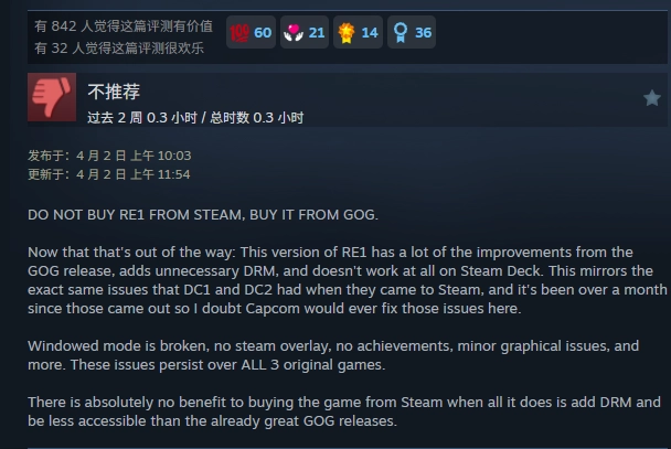 DRM一直是在意隐私、担心性能受影响的玩家们关注的焦点,这次也不例外,引发了不少不满。有玩家评论说:“别在Steam上买《生化危机1》,去GOG买吧。”这位玩家提到,Steam版本存在窗口模式用不了、没有Steam界面、没有成就、图形方面有小问题等缺点。还有用户反映,这些版本在Steam Deck上不能正常运行,或者在部分PC上直接启动不了。