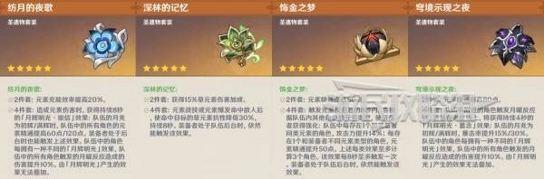 其次是【深林的记忆】与【饰金之梦】这两套圣遗物。其中【深林的记忆】更适合队伍里没有其他角色佩戴该套装的情况,它能带来草元素抗性降低30%的效果,对所有绽放体系的伤害都有全面提升,不过更理想的使用方式是让其他辅助角色来携带。【饰金之梦】则可以大幅堆叠元素精通,既能提高绽放伤害,也能增强增益效果的量,建议搭配两名及以上的非草系角色使用。最后要提到的是【穹境示现之夜】,这套圣遗物仅推荐给满精炼的输出型配置使用,当月兆效果达到最大化时,30%的暴击率加成作用明显,还能大幅延长月绽放的伤害时间,并且当队友装备【纺月的夜歌】时,其效果还能得到进一步提升。