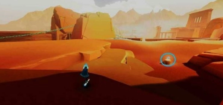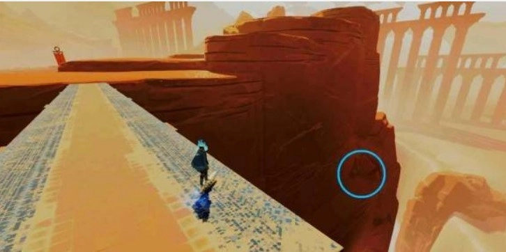 返回建筑外,朝锁链延伸的方向前进。向左下方望去,可见区域边缘有两根较矮的石柱。