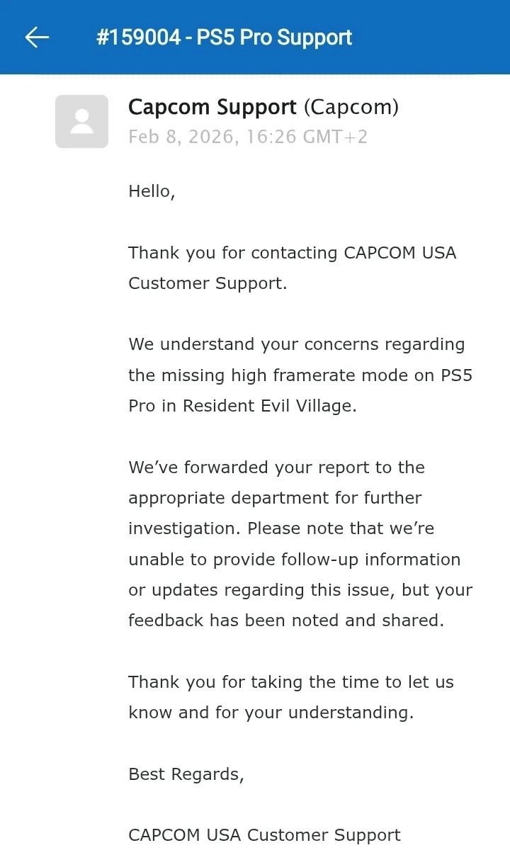 根据网络用户反馈,《生化危机:村庄》更新后不再支持PS5 Pro的增强功能。当游戏在PS5 Pro与兼容电视上运行时,120Hz高刷新率模式无法启用。部分用户已尝试联系卡普空寻求解决方案,但截至目前,仅收到客服的官方标准回复。