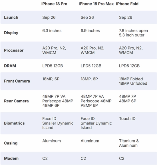 现在,分析师在报告里详细介绍了iPhone 18 Pro、iPhone 18 Pro Max以及iPhone Fold的各项参数。