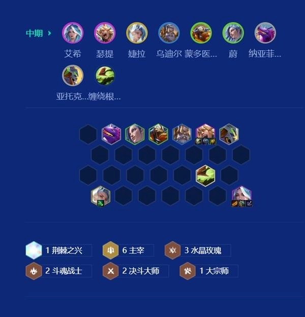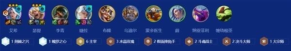 阵容在8人口时开始搜牌,先全力D牌凑出6主宰羁绊和艾希。接着要在4-5阶段前尽快D出两星瑟提与两星艾希,之后攒钱升级到9人口,补充婕拉、布隆、盲僧来提高阵容上限。