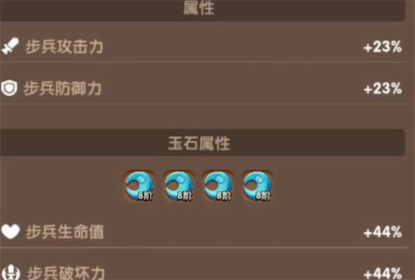 3、在神兵与玉石的养成方面,步兵和弓兵需进行明确区分,属性切勿混淆,养成梯度也得严格把控:步兵的养成标准为,神兵阶数要比弓兵高出3-5阶,玉石属性大概是弓兵的1.5倍左右,不必强行卡精准数值,但心里一定要有这个概念,所有精炼以及玉石资源都要优先向步兵倾斜。步兵对应的玉石属性是生命,神兵则主打防御与生命,核心在于能抗能稳,这是整个队伍的根基所在。