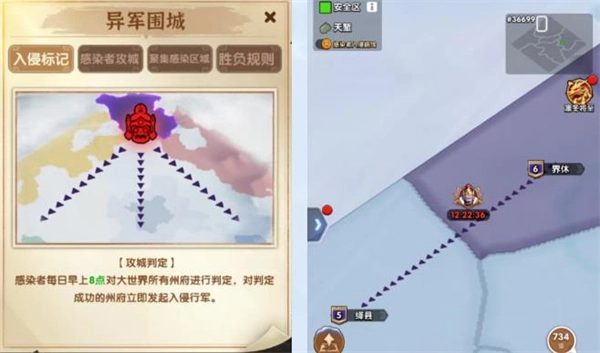2、感染者入侵机制:赛季开启后,感染者大军将从晋阳大举出动,如瘟疫般向南蔓延,侵蚀并感染其他州府。每日早晨8点,感染者会对大世界中的州府宣战,并启动入侵行军。晚间20:00-20:30,感染者大军会对已宣战的州府发动进攻,该进攻不受免战效果影响。若某州府被感染者宣战,那么在20:00-20:50期间,其他联盟无法对其宣战。感染者的进攻分为噩梦、困难、普通三种强度,强度越高,感染者的战斗属性、进攻频率及进攻数量就越惊人。在攻城过程中,一旦州府的精锐守军被击败一次(即破城),州府就会进入感染状态,以每20秒损失1支守军的速度持续削减守军数量。使用解药可解除这种持续掉血的状态。