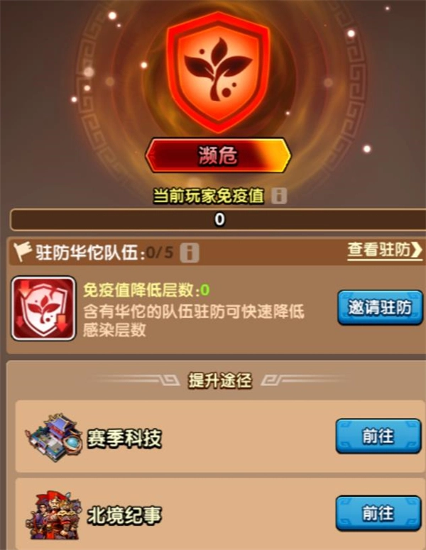 7、通常免疫值降低效果的自动恢复时长为20秒,每20秒恢复1层。若自身城池驻防了带有华佗的队伍,可加快免疫值降低效果的清除速度,驻防的该类队伍数量越多,清除效率越高,最多一次能清除5层。因此,华佗在本赛季的作用尤为关键,建议专门为华佗单独编队,便于互相驻防以快速清除免疫值降低效果,从而维持高免疫值状态持续作战。