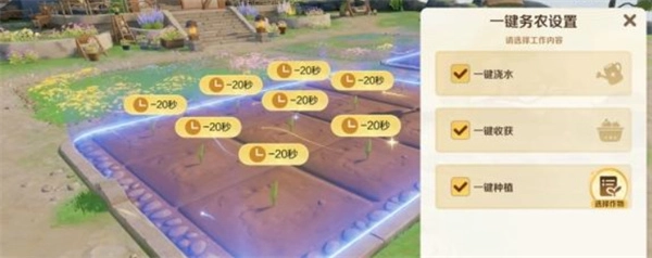 随着农场等级的提高,农场灵像将解锁一键务农功能,包含便捷的一键浇水、一键收获、一键种植等操作。请积极提升农场等级,开启更多实用的便捷功能!