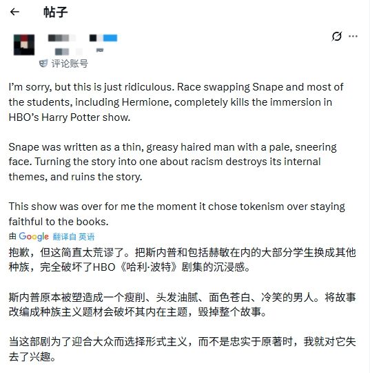 不出所料,批评声最集中的是帕帕·埃西杜饰演的西弗勒斯·斯内普。不少观众称,尽管大家早已经接受黑人演员出演这个角色,但预告里斯内普的脏辫和皮夹克造型,完全打破了角色原本的样子,让他在霍格沃茨里显得特别突兀。