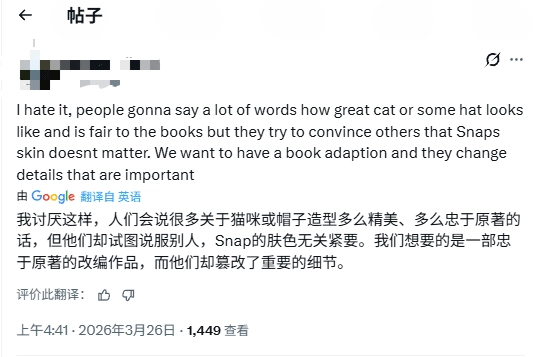 在YouTube平台上,这支预告片收获了13.8万次点赞和4.6万次点踩。一些观众认可预告片中呈现了原著里有、但电影版未涵盖的内容,不过也有观众对预告片中平淡的配乐、对电影版场景的直接复刻,以及不尽如人意的角色选角表达了不满。