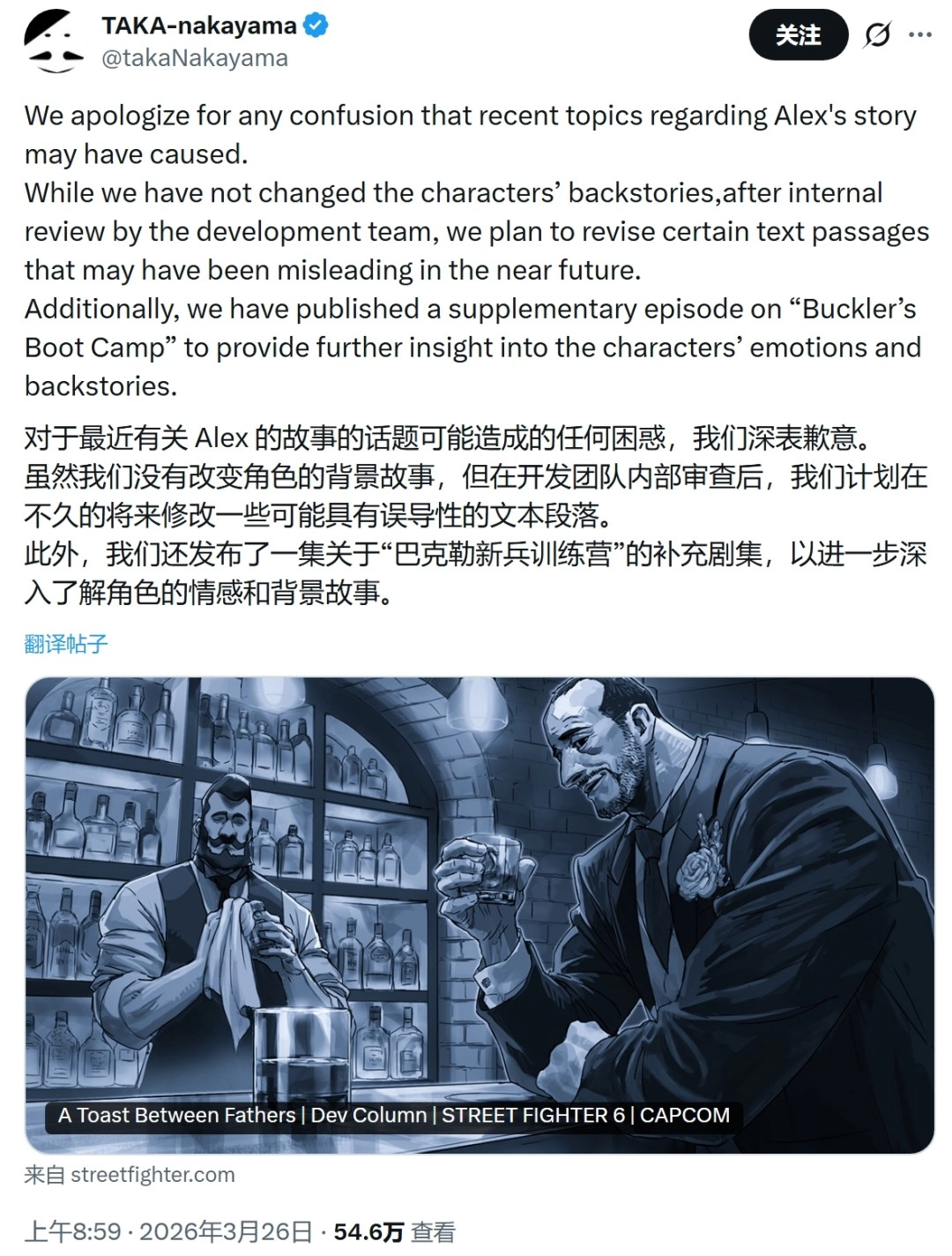 《街头霸王6》在上周推出了经典角色阿莱克斯的DLC。这位从《街霸3》时期就登场的战士原本应该受到很多期待,但却因为新增的背景故事引发了很大的争议。争议的程度非常大,以至于游戏总监中山贵之不得不出来道歉,并且承诺会对相关的文本进行修改。