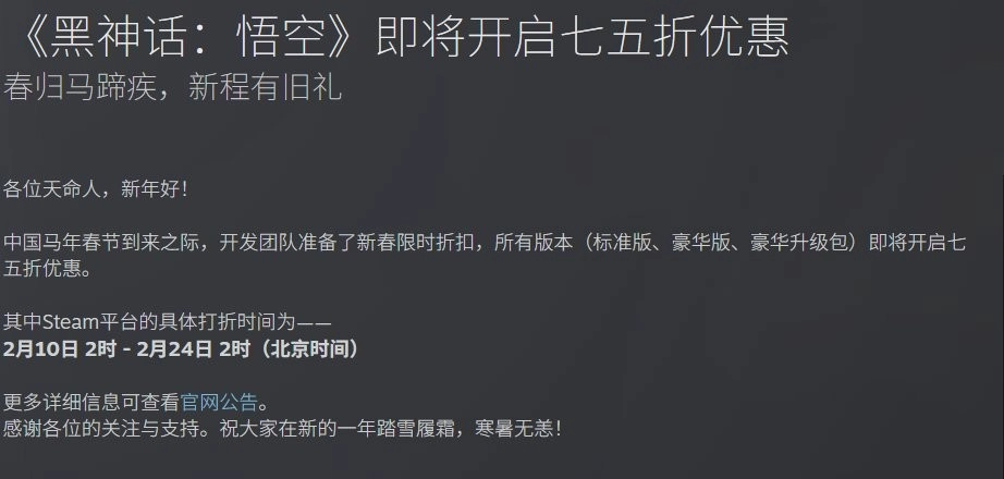 为迎接马年春节的到来,《黑神话:悟空》今日正式开启新春限时折扣活动,PC端的Steam、Epic、Wegame三大平台上的所有版本均同步参与,玩家可享受七五折的优惠福利。