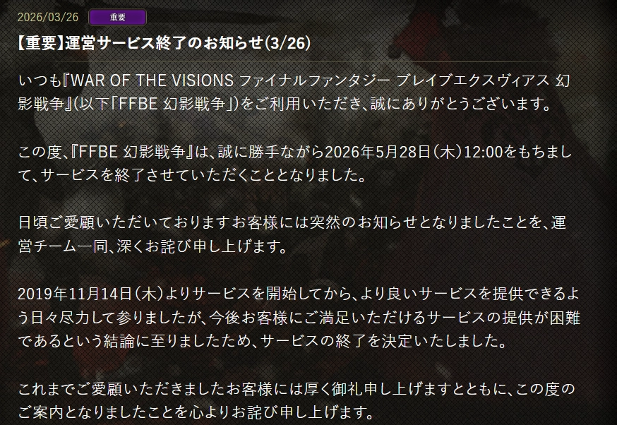 今日,发行商史克威尔艾尼克斯与开发商gumi共同宣布,《最终幻想:勇气启示录幻影战争》的日服将在5月28日正式停止运营。这款游戏最初于2019年11月14日在日本的iOS和安卓平台上线,随后在2020年3月25日面向全球发行。而国际服则已在2025年5月30日提前终止了服务。