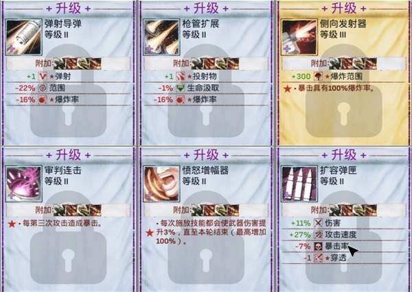 因为加弹射和投射物的属性都会降低爆炸率,所以我们干脆彻底放弃爆炸率,优先提升投射物和弹射属性,接着再考虑电击伤害和攻击速度。由于我们完全不加点爆炸率和暴击,所以即使有侧向发射器和审判连击这两个选项,也可以放心点选。