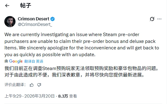 《红色沙漠》已于3月20日正式上线。据统计,该游戏在Steam平台的最高同时在线玩家数量达到239045人。不过,有部分玩家反映无法领取预购奖励和豪华版礼包,开发商Pearl Abyss目前已针对这一问题进行调查。