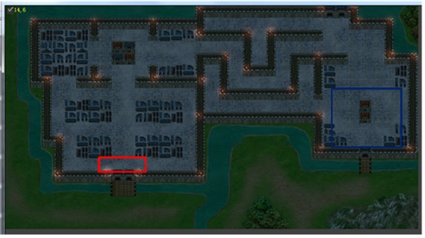 本关十分考验操作与走位。每当尉迟恭被击退1次,就会回到红圈并带领一波兵出现。当城外敌军达到一定数量后,红框处也会出现一波伏兵。本关的难点在于对粮车的把控。与粮车对话后,粮车会自动前往左下角,若地图上包括粮车在内的敌军数量大于等于十人时,粮车就会不断叛变。所以有两种方法,第一种是携带令箭定住粮车,等清理完敌军后再让它们离开;第二种是迅速跑到红线处拉起封锁线,阻止它们向上行进。大约在第十回合,蓝框处会出现一波十人规模的伏兵。第十五回合时,红框处会出现一波复活的敌军。击退尉迟恭3次,且在二十回合内过关,尤俊达就能学会踏破联营。在二周目时全灭敌军过关,可奖励尤俊达成长点数,若拥有皮肤还能额外获得两点奖励。
