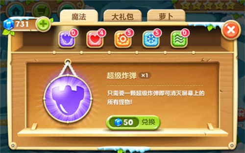 效果:只需要一颗超级炸弹即可消灭屏幕上的所有怪物!需要50宝石兑换。
