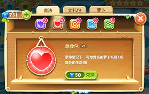 效果:紧急情况下,可为受伤的萝卜恢复1点额外的生命值!需要50宝石兑换。
