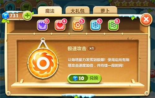 效果:让炮塔能力发挥到极限!使用后所有炮塔攻击速度加倍,并持续一段时间。需要10宝石兑换。