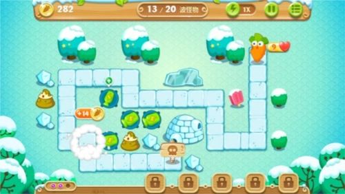 3、在保卫萝卜2游戏中有14个风格独特的防御塔,鱼刺塔、太阳花、便便塔、船锚塔,更多花样等你探索