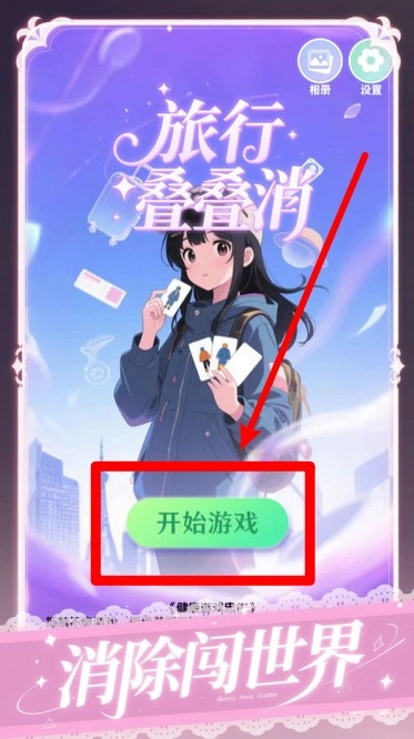 1. 启动界面设有“开始游戏”按钮,玩家点击该按钮后,便能进入卡片消除关卡,开启专属于自己的趣味旅行挑战之旅。
