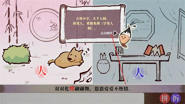 1、进入字里人间界面后,查看小毛笔提供的提示信息,点击继续按钮就能进入游戏的下一个操作环节。